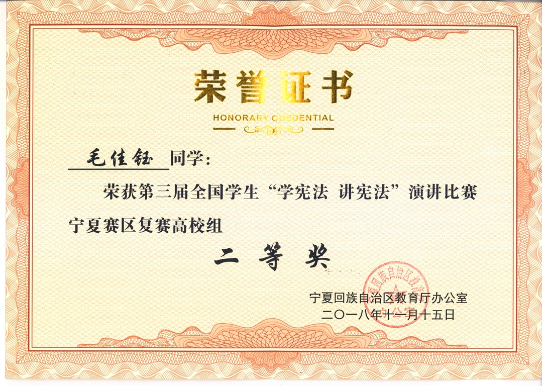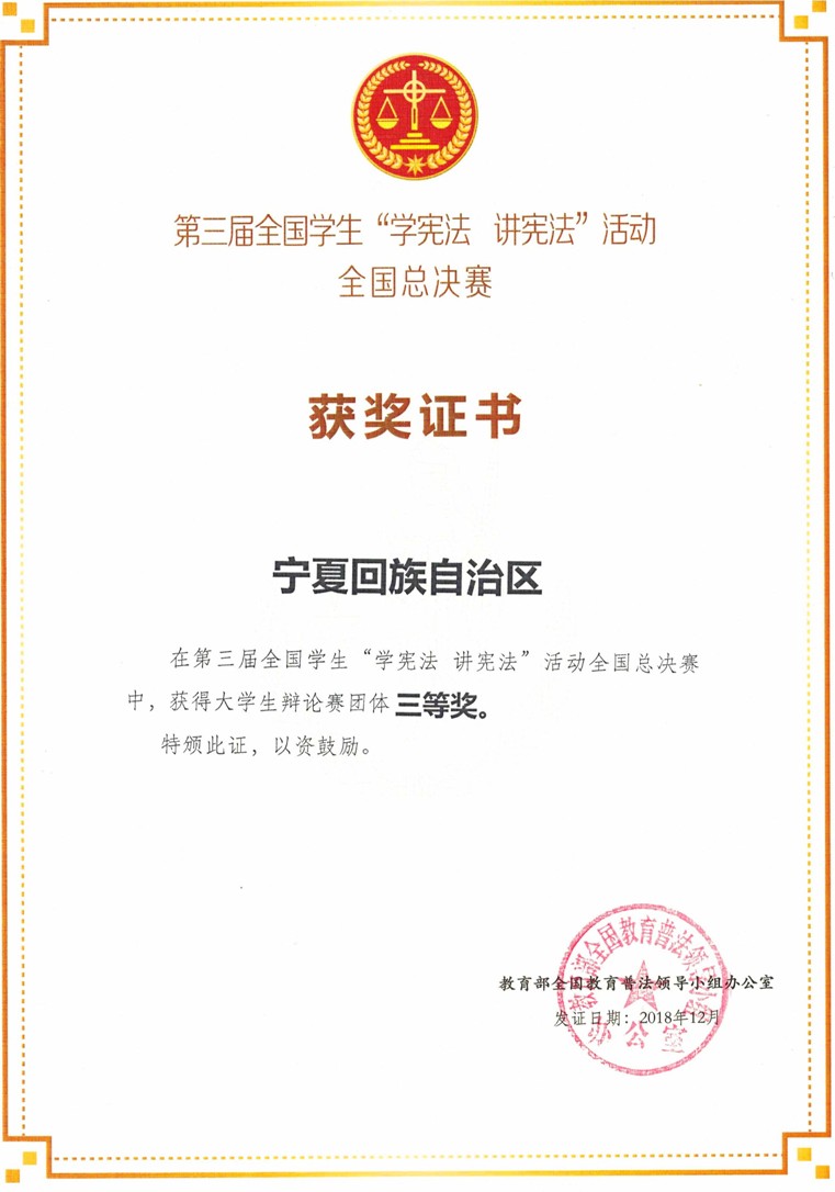 法学专业本科生童鹏、张航溥、毛佳钰与区内其他院校代表组成宁夏回族自治区代表队赴京参赛,最终获得大学生辩论赛团体三等奖,知识竞赛二等奖,张弛和张蕊老师获得优秀指导教师奖。