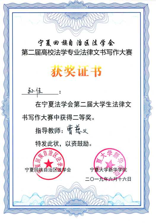 法学专业本科生孙佳在曹慈义老师指导下,获得大赛二等奖。
