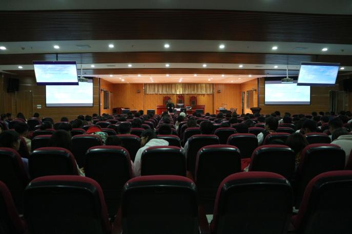 在模拟法庭举办“资助政策解读及励志感恩教育”专题讲座,学院党委副书记崔明堂担任主讲,2019级全体本科新生到场聆听。