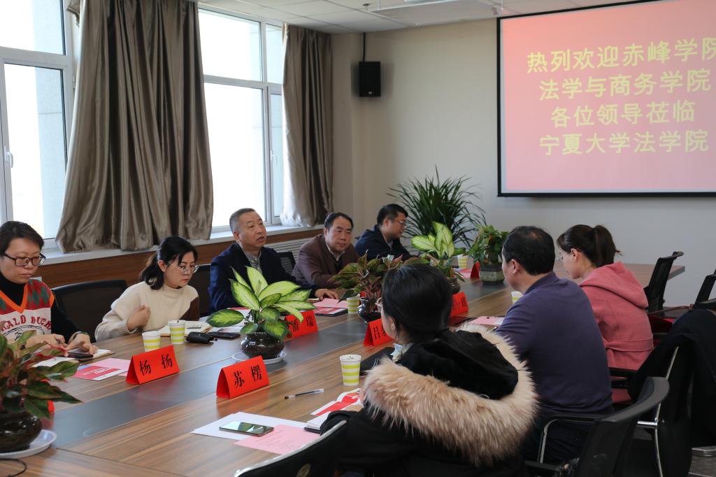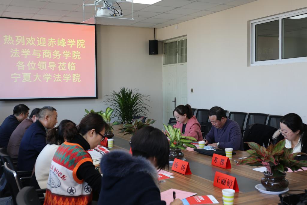 11月6日上午,赤峰学院法学与商务学院院长吕东明、民商法法学教研室主任王一琪、刑法程序法学教研室苏楞一行3人来院调研座谈。17k小说 党委书记潘瑞、院长吕耀军、党委副书记杨扬、法律系主任张弛、法理学硕士点负责人张驰、法律实践教学中心副主任王丽婷参加座谈会。双方就专业建设、人才培养等方面进行了深入交流。
