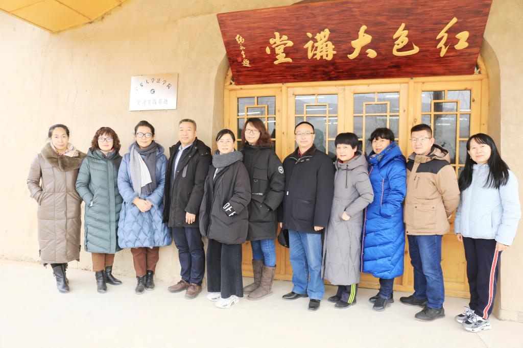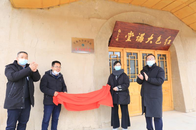 实习实践基地挂牌仪式。马国荣局长、潘瑞书记、吕耀军院长、将台堡红军寨负责人谢宏义共同为实习实践基地揭牌。