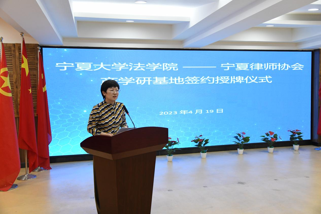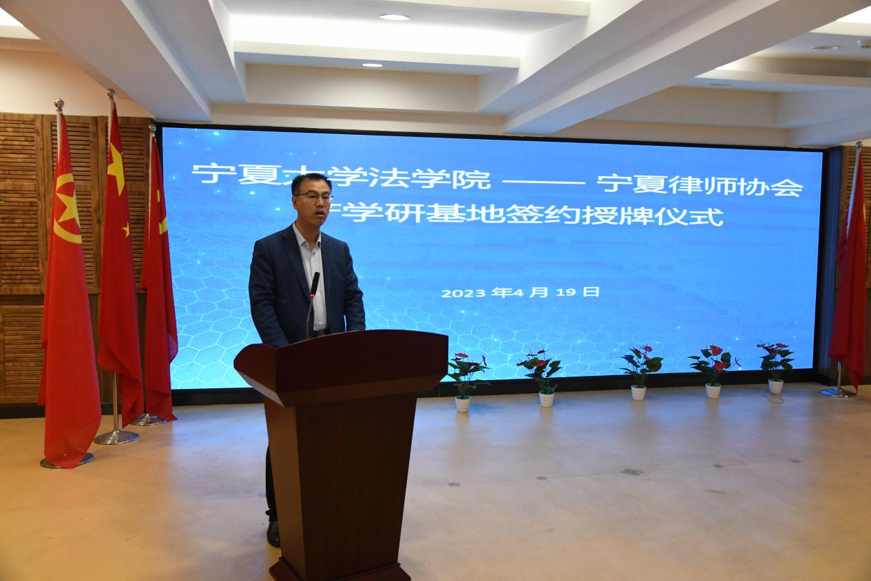 致辞,指出建立产学研基地对培养自治区优质法律人才具有非常重要的意义,对双方合作背景和意义进行介绍,对宁夏律师协会的工作表示感谢,为未来产学研基地建设提出了期许。