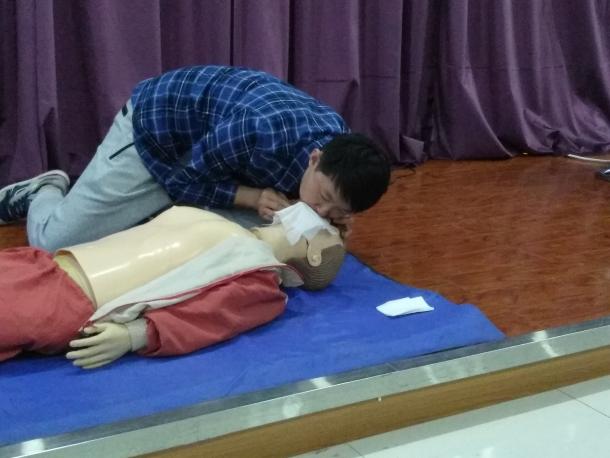 首先,冯珂教授列举了几个因无法得到急救而死亡的故事案例,在为这一次次悲剧痛心惋惜的同时,冯教授深刻地阐述了急救知识的重要性。接下来,冯教授从心肺复苏术、气道梗阻急救、心绞痛家庭急救、创伤急救、脑猝家庭急救和烧烫伤现场急救等六大方面进行了详细讲解。他分别从原因、步骤与可能结果等角度使同学们获得了必要的急救知识,提高了急救能力。实践是理论之源,冯教授还带领同学们作了现场急救模拟,使大家规范急救动作要领,加深对急救措施的印象。在讲座最后环节,冯教授为同学们播放了宁夏医科大学总医院制作的现场急救视频,不仅丰富了急救知识讲解的形式,还使同学们深刻地明白"该出手时就出手"的必要性,以及"时间就是生命"的急救准则。