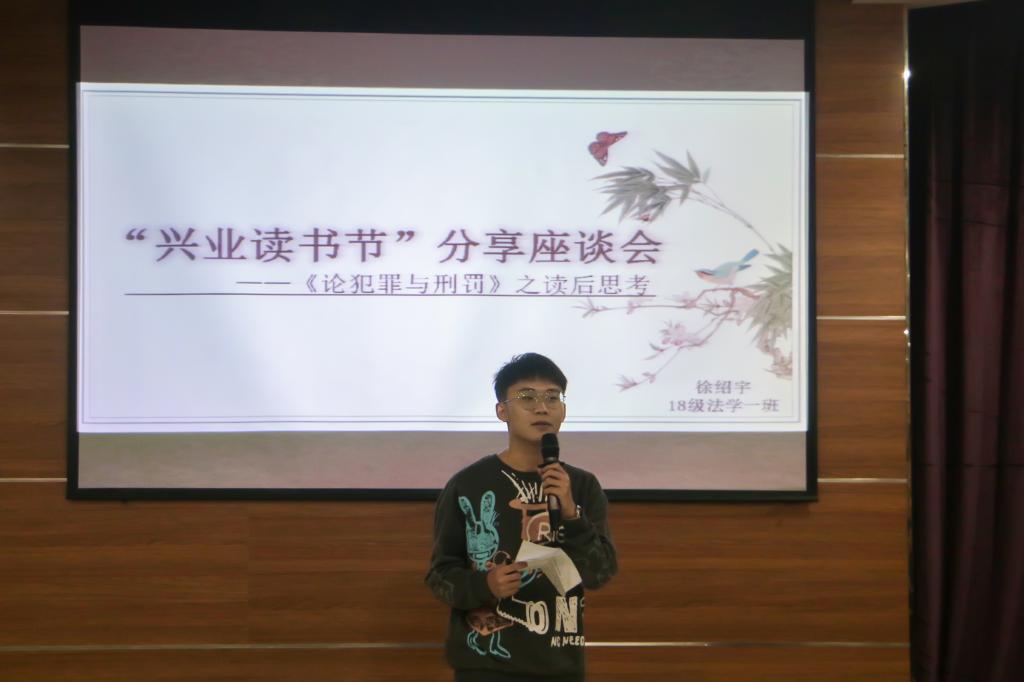 在读书分享环节,2020年“兴业读书奖学金”获奖学生2019级民商法学研究生汪义双、2018级法学一班徐绍宇、2019级哲学班研究生赵潇、2019级法学一班杨丽分别作了题为《浅谈<民法学说与判例研究>中的民法方法论》、《<论犯罪与刑罚>之读后思考》、《<论神学政治论>中的“宗教”与“理智”——<神学政治论>读后感》和《有<西班牙旅行笔记>陪伴的日子》的读书分享。活动最后,宁夏兴业律师事务所合伙人郝运清致辞,他鼓励同学们多读书,读好书,用书籍丰富生活,以知识充实人生。