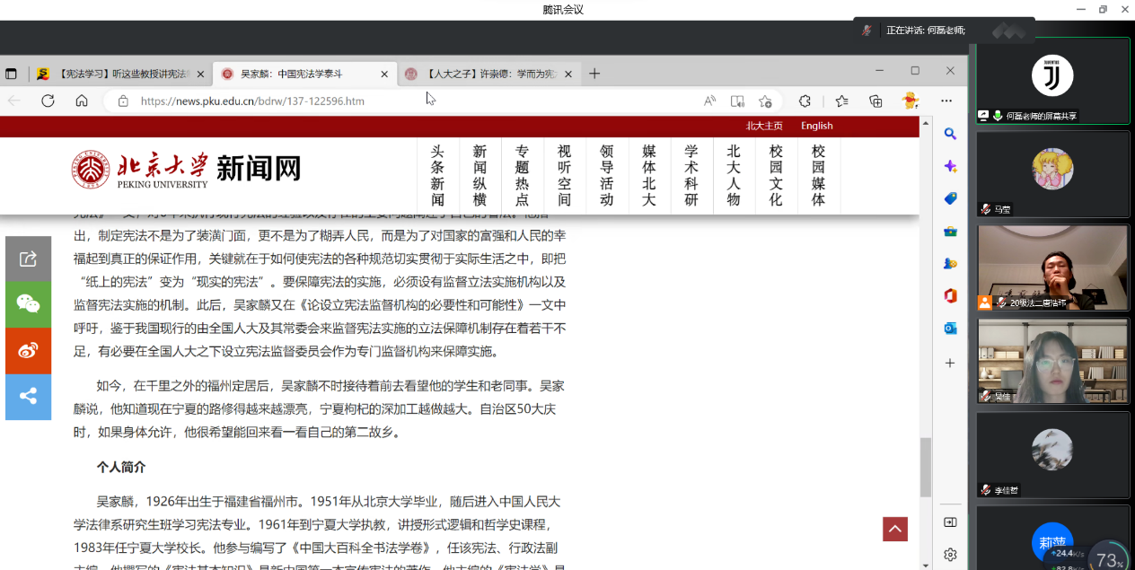 主题活动分为两个部分,第一部分活动是吴家麟老先生和许崇德老先生的学术生涯回顾。在何磊的讲述中,同学们了解到:吴家麟老先生1926年出生于福建省福州市,享年91岁。1951年从北京大学毕业,随后进入中国人民大学法律系研究生班学习宪法专业,同年,调入本校国家法教研室任教。1961年到17k小说