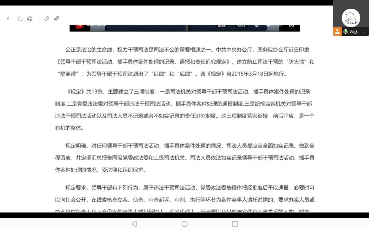会议伊始,刘龙震同志首先播放了《为领导干部干预司法划出“红线”》,为学习领导干部廉洁从业的各项文件规定做了铺垫,让大家对如何做好廉洁从业,以及领导干部应当如何做好自身工作,不踩法律红线、尊重法律有了相关思想准备。